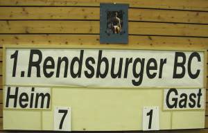 Leider hatten die Rendsburger aber vergessen, bei dieser Anzeige für die Gäste mehr Ziffern als nur die "0" oder die "1" vorzubereiten. Da wir ja als nette Gäste bekannt sind und die Rendsburger nicht in Verlegenheit bringen wollten, haben wir dann natürlich auch extra nicht mehr Punkte erzielen wollen. Von diesem kleinen - aber ärgerlichen - Zwischenfall einmal abgesehen, hat es mal wieder sehr viel Spaß gemacht, gegen unsere - im wahrsten Sinne des Wortes - alten Freunde/innen zu spielen. Anmerkung