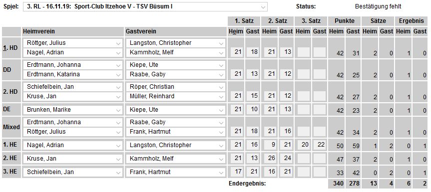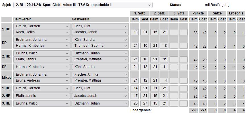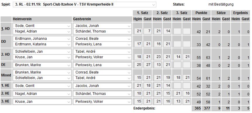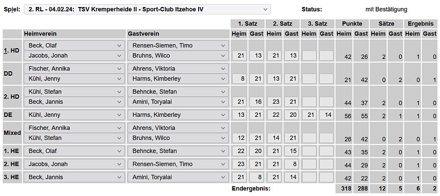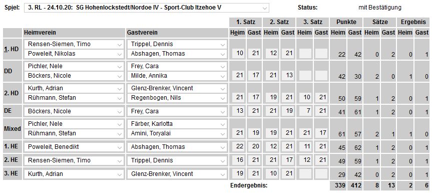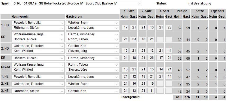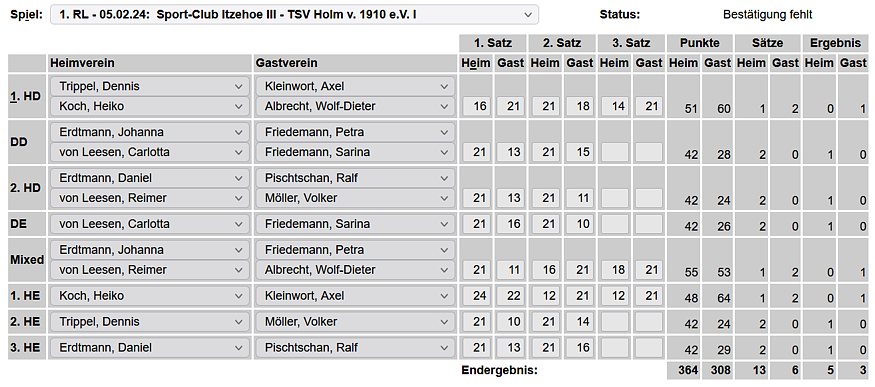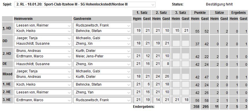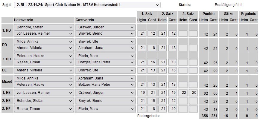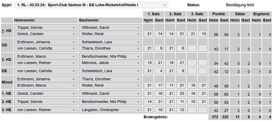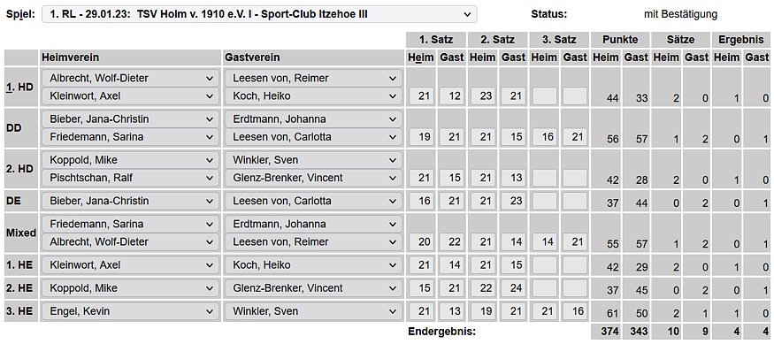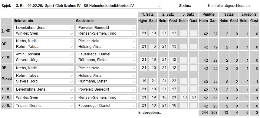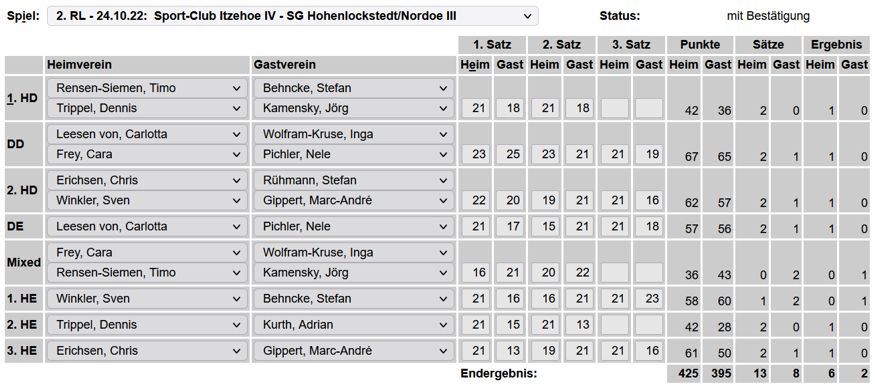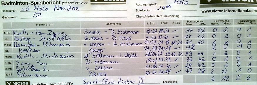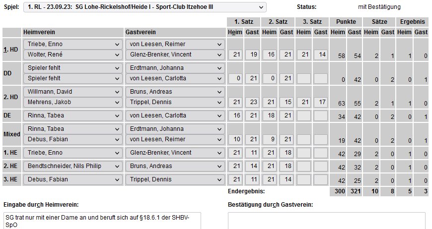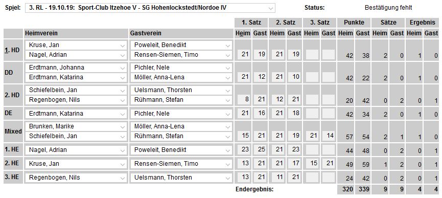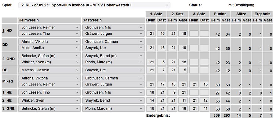 in der Landesliga Nord gegen die SG Rendsburg/Eckernförde II, Heimsieg unserer zweiten Mannschaft in der Landesliga Süd gegen die SG BSG/Riemann Eutin, dritte Mannschaft mit Auswärtsniederlage bei der SG Lohe-Rickelshof/Heide, Auswärtsniederlage unserer vierten Mannschaft beim Barmstedter MTV III. |