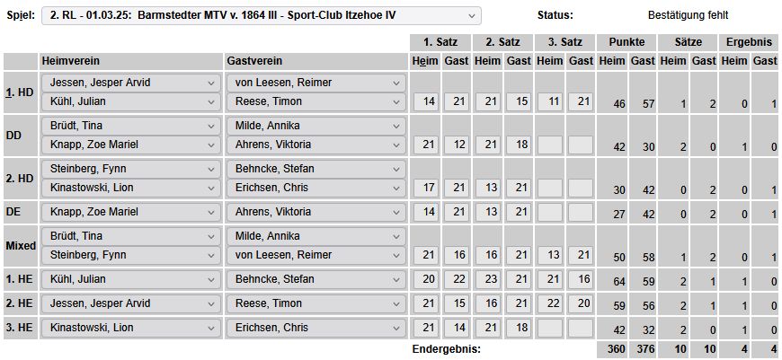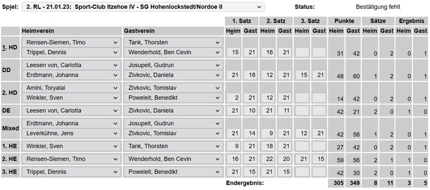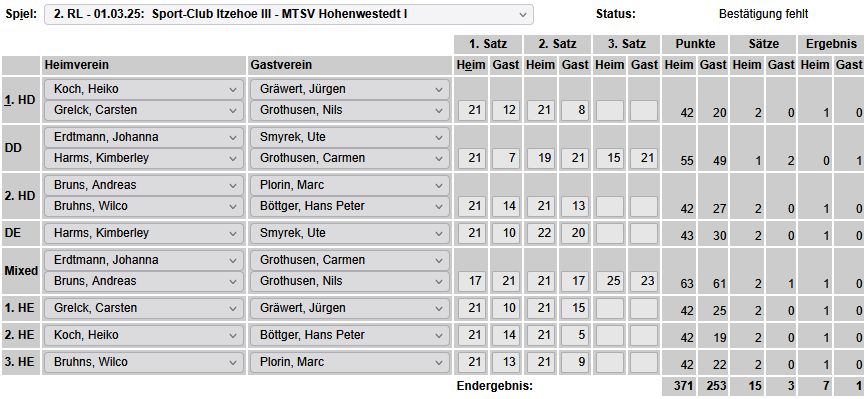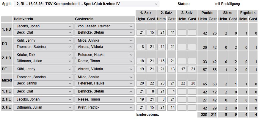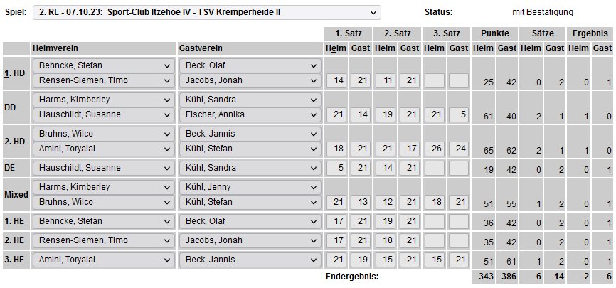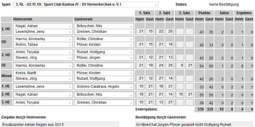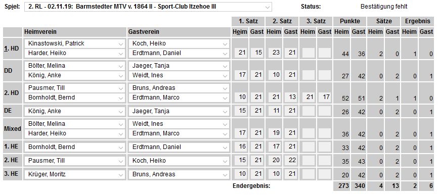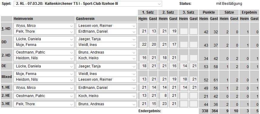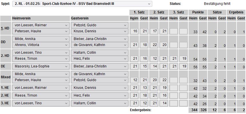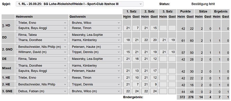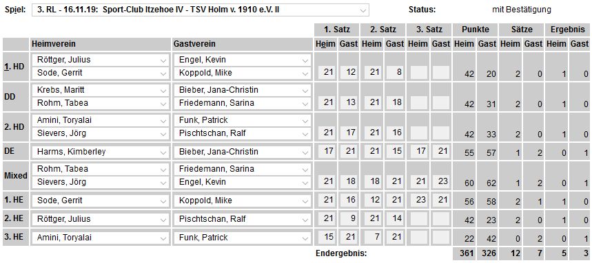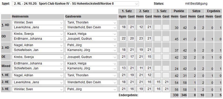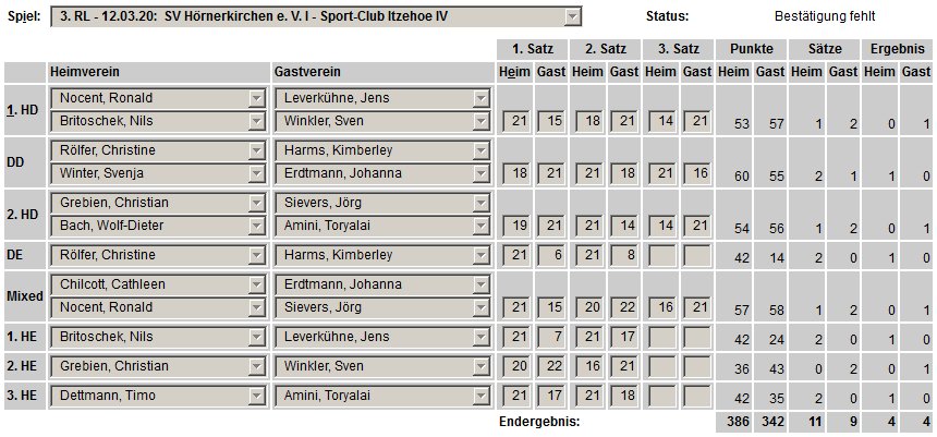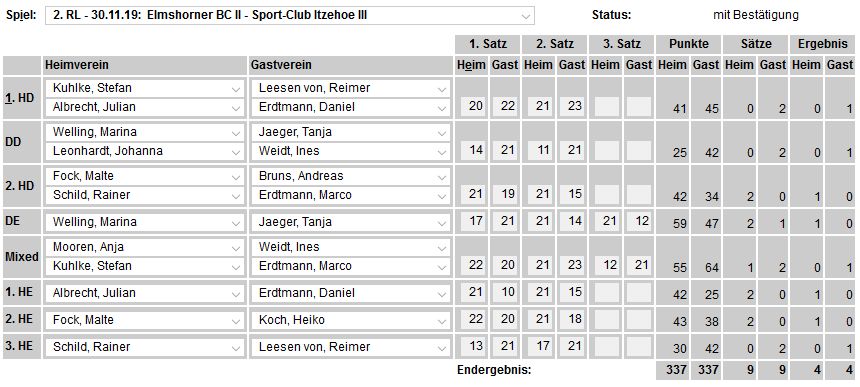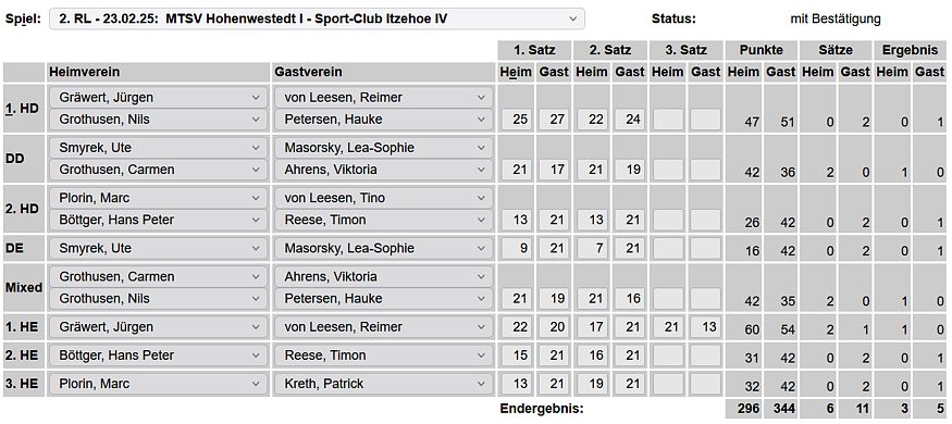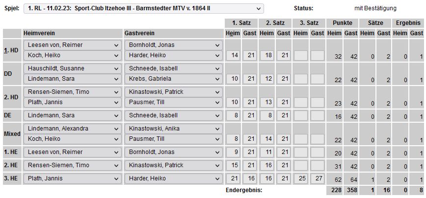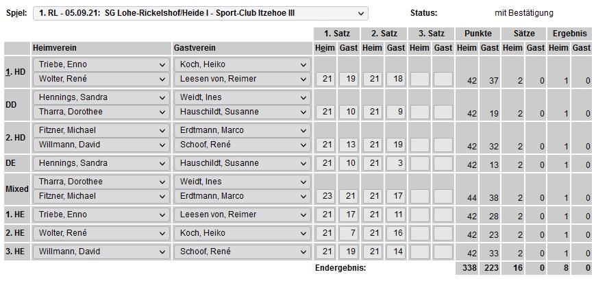 in der Landesliga Nord gegen die SG Rendsburg/Eckernförde II, Heimsieg unserer zweiten Mannschaft in der Landesliga Süd gegen die SG BSG/Riemann Eutin, dritte Mannschaft mit Auswärtsniederlage bei der SG Lohe-Rickelshof/Heide, Auswärtsniederlage unserer vierten Mannschaft beim Barmstedter MTV III. |