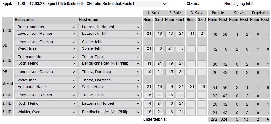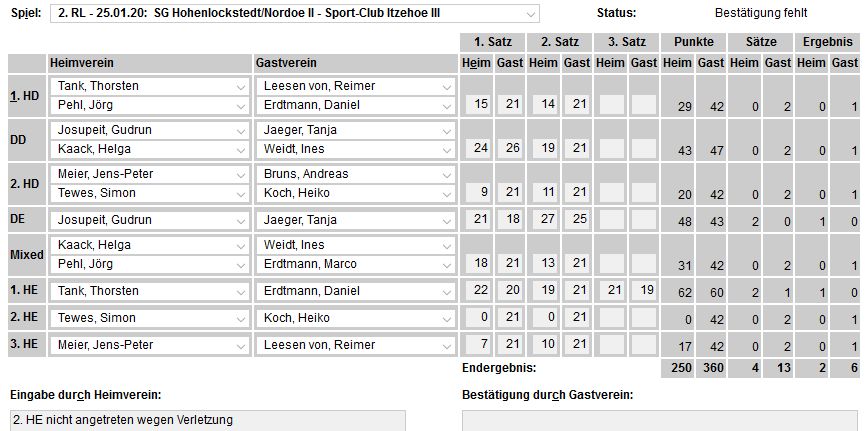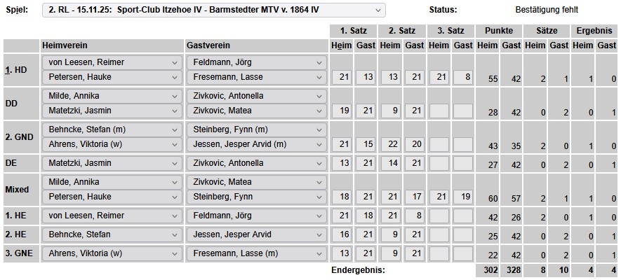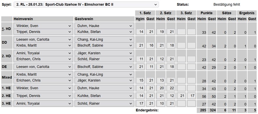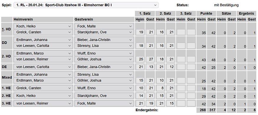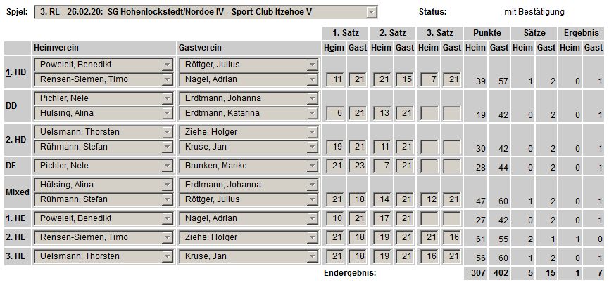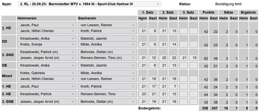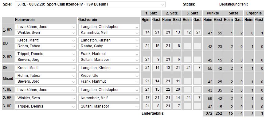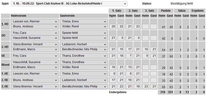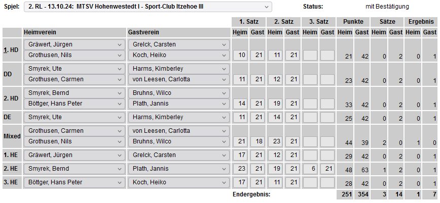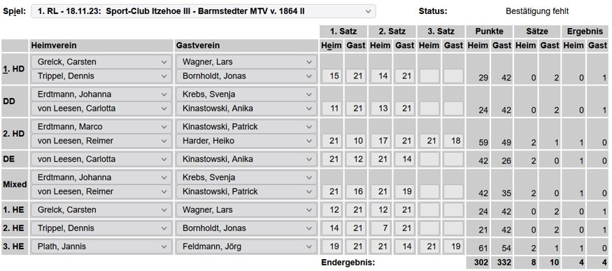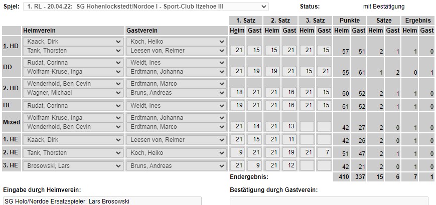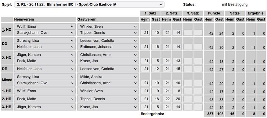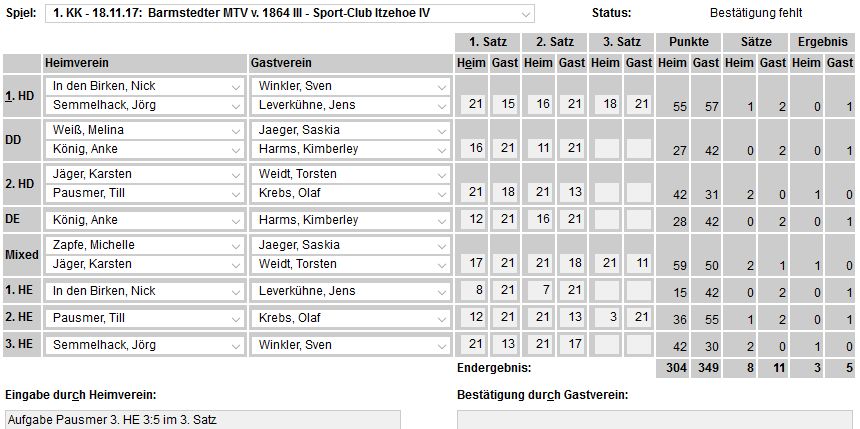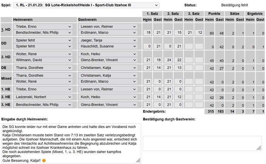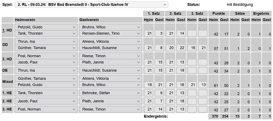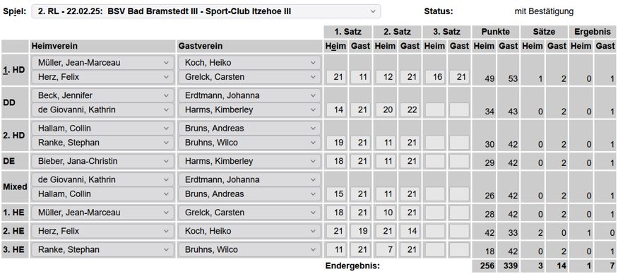 in der Landesliga Nord gegen die SG Rendsburg/Eckernförde II, Heimsieg unserer zweiten Mannschaft in der Landesliga Süd gegen die SG BSG/Riemann Eutin, dritte Mannschaft mit Auswärtsniederlage bei der SG Lohe-Rickelshof/Heide, Auswärtsniederlage unserer vierten Mannschaft beim Barmstedter MTV III. |