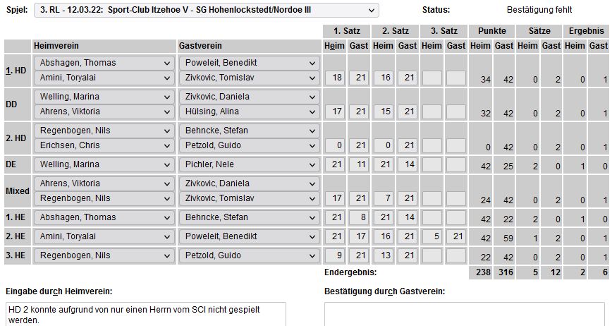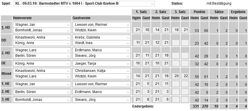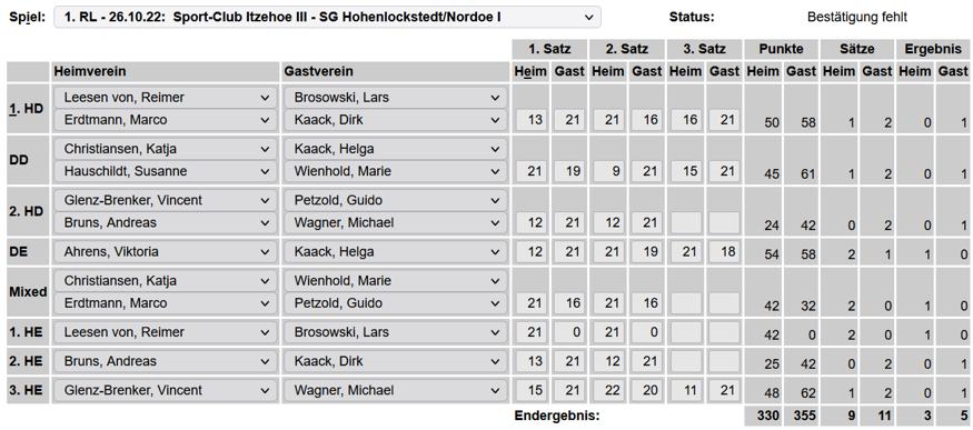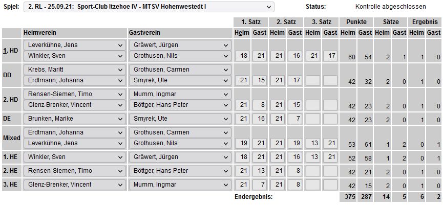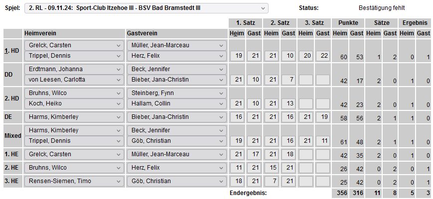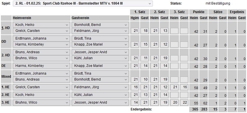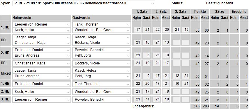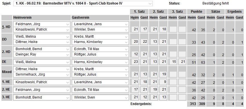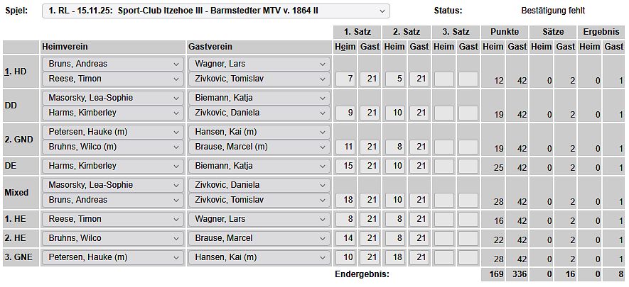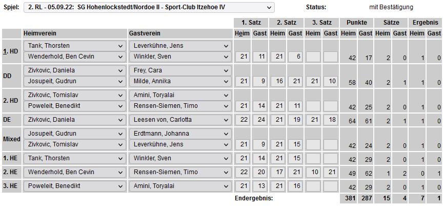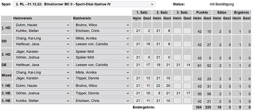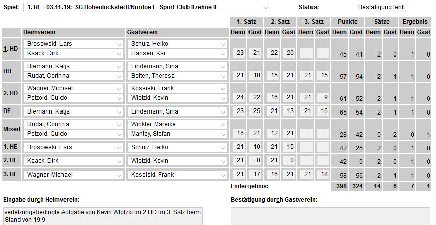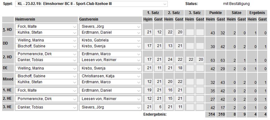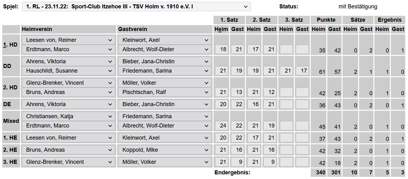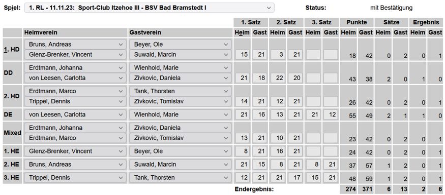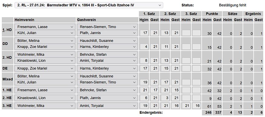 in der Landesliga Nord gegen die SG Rendsburg/Eckernförde II, Heimsieg unserer zweiten Mannschaft in der Landesliga Süd gegen die SG BSG/Riemann Eutin, dritte Mannschaft mit Auswärtsniederlage bei der SG Lohe-Rickelshof/Heide, Auswärtsniederlage unserer vierten Mannschaft beim Barmstedter MTV III. |