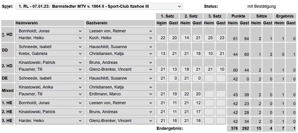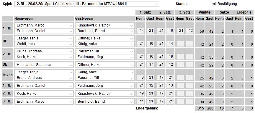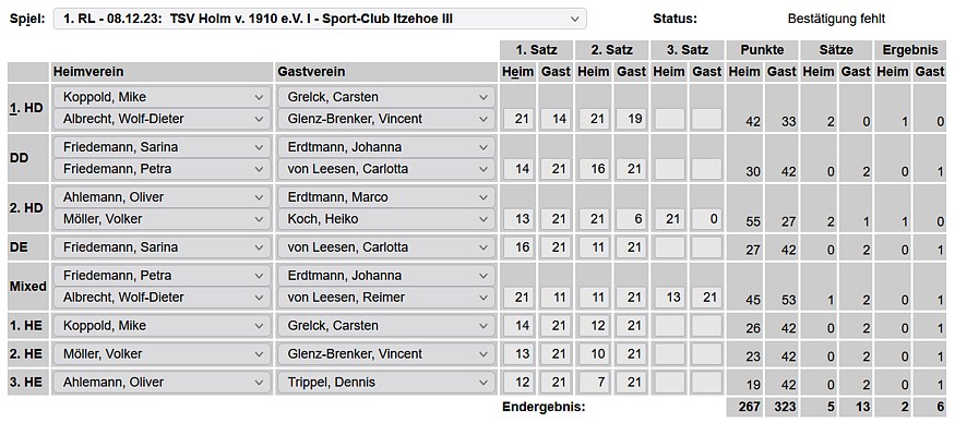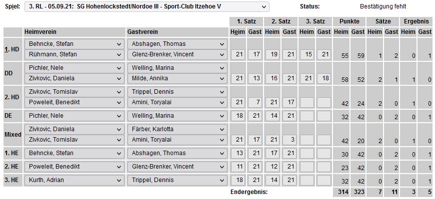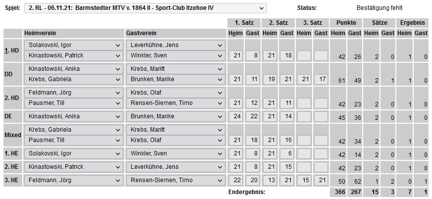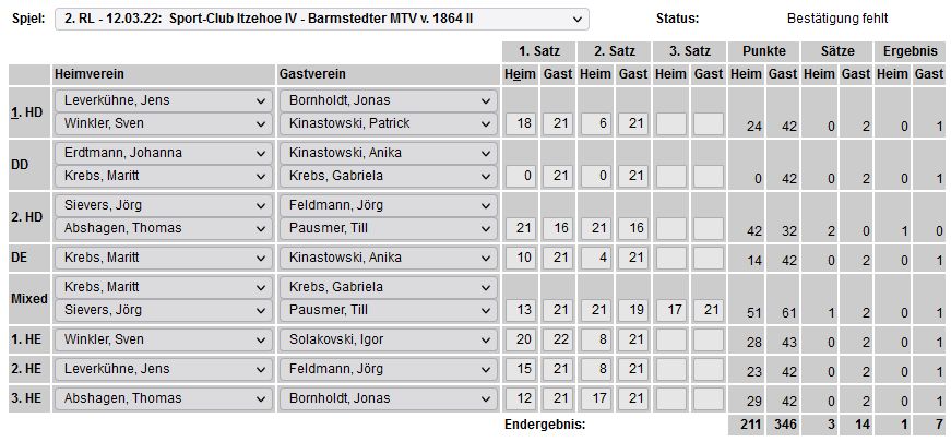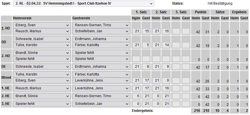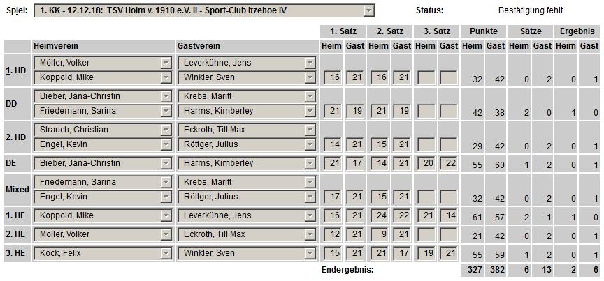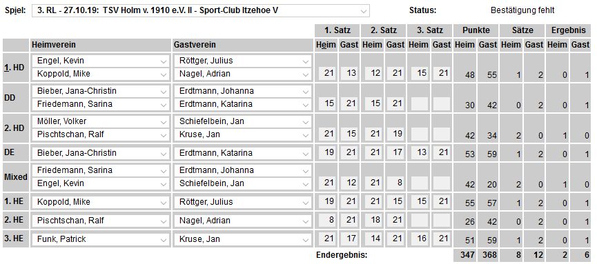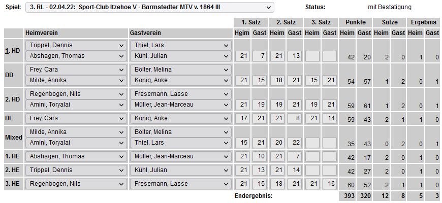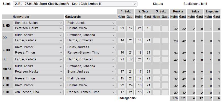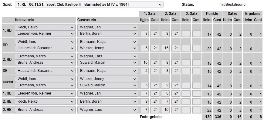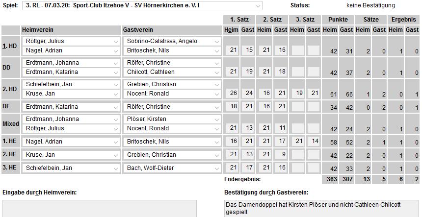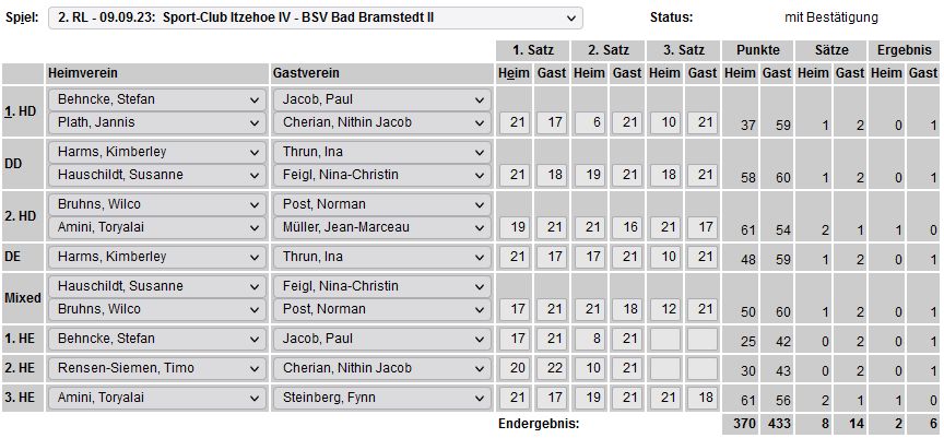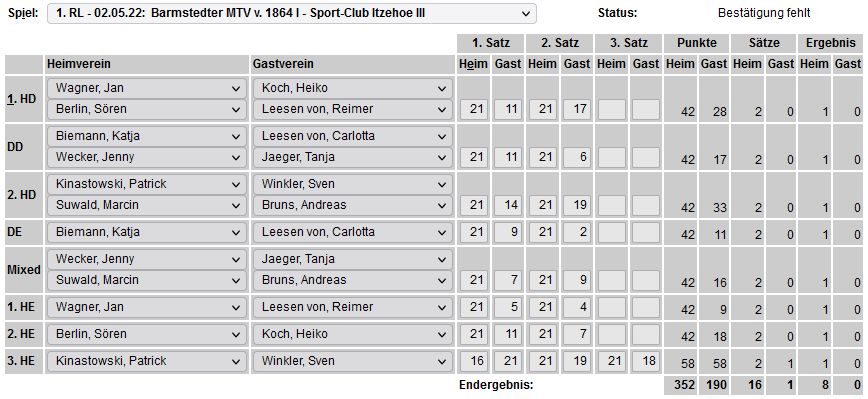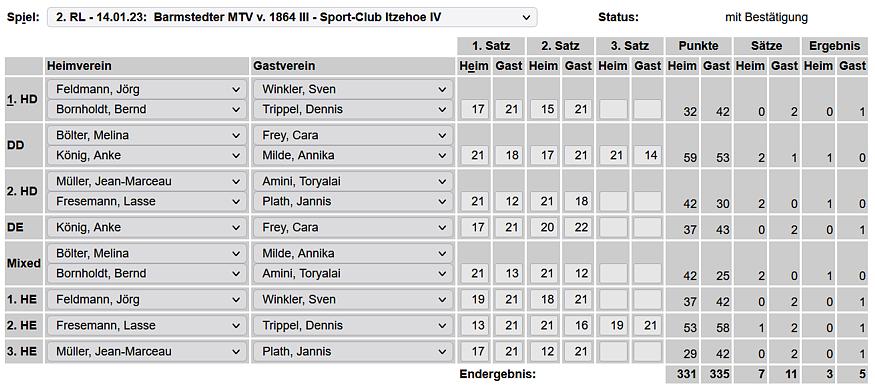 in der Landesliga Nord gegen die SG Rendsburg/Eckernförde II, Heimsieg unserer zweiten Mannschaft in der Landesliga Süd gegen die SG BSG/Riemann Eutin, dritte Mannschaft mit Auswärtsniederlage bei der SG Lohe-Rickelshof/Heide, Auswärtsniederlage unserer vierten Mannschaft beim Barmstedter MTV III. |