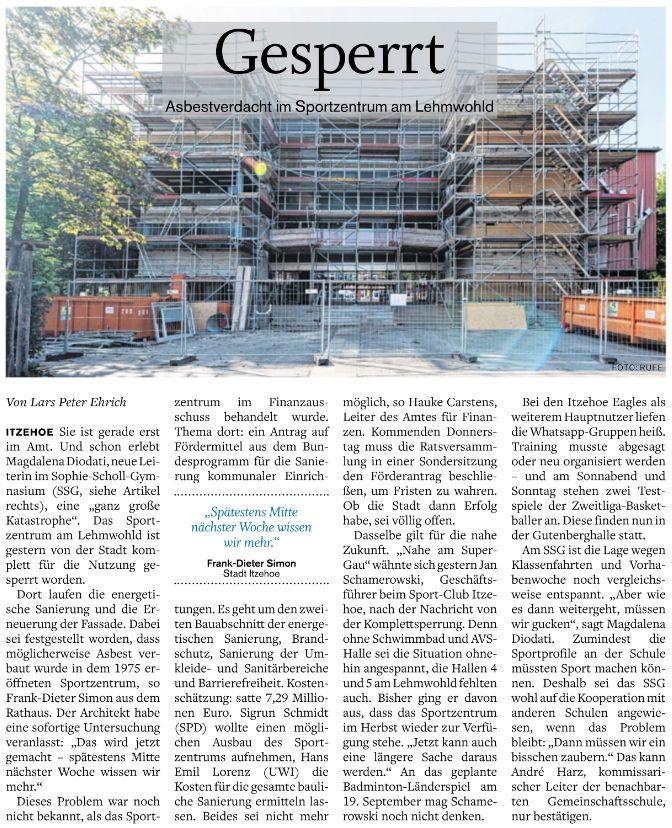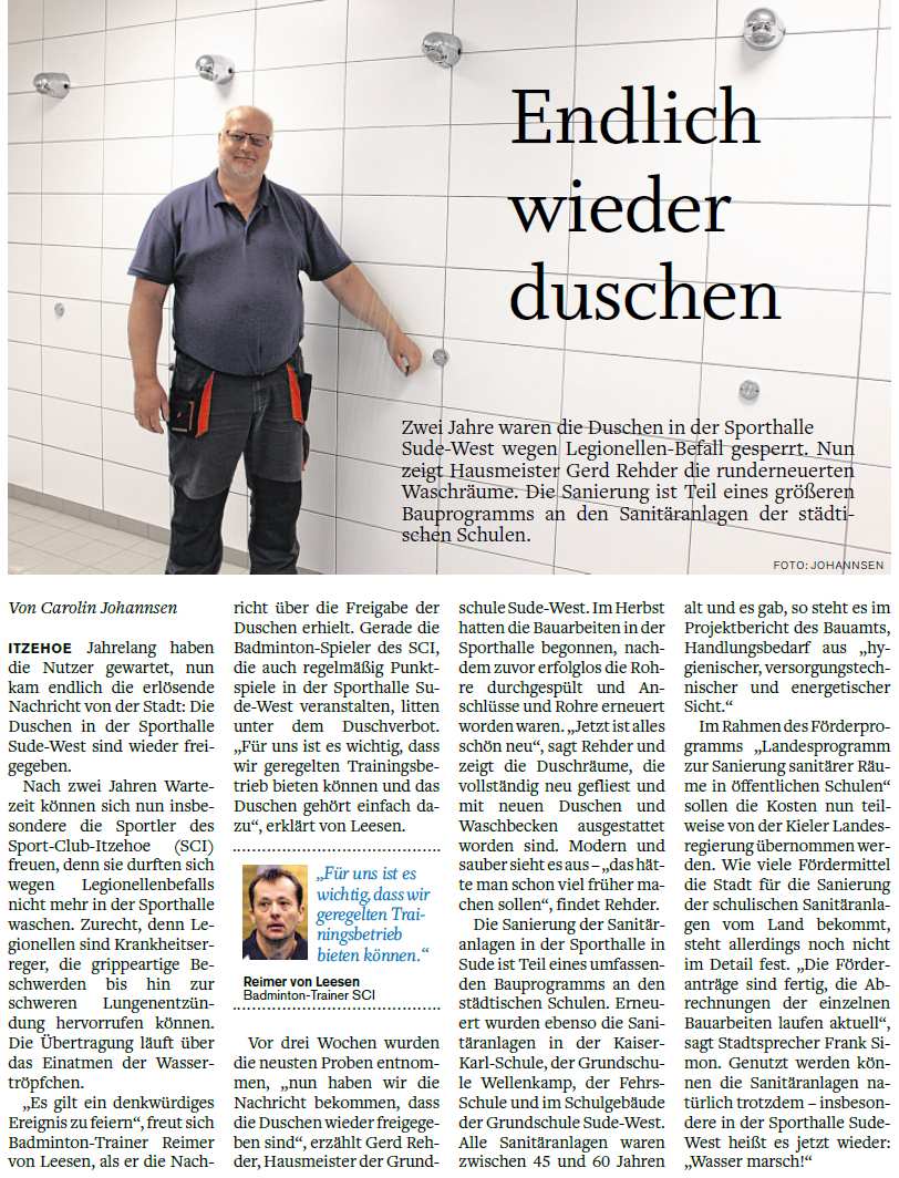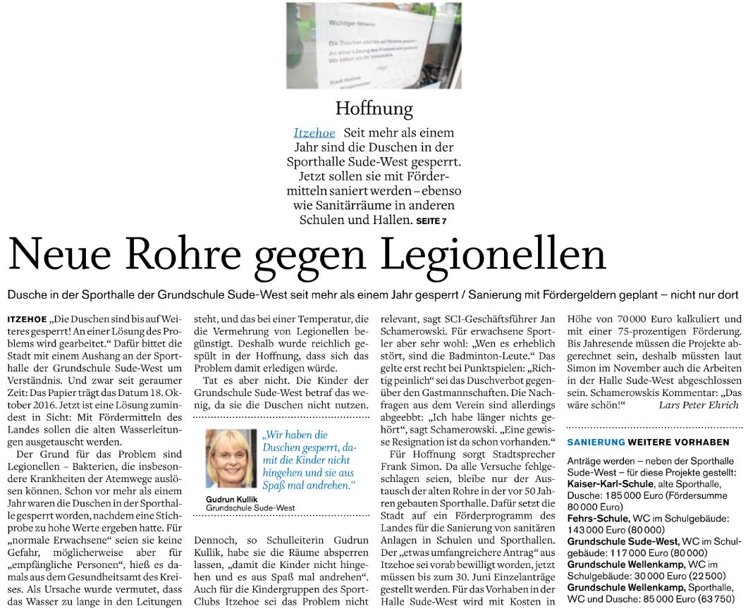 in der Norddeutschen Rundschau über Legionellen in Sude-West und die Sanierung von Sporthallen. |