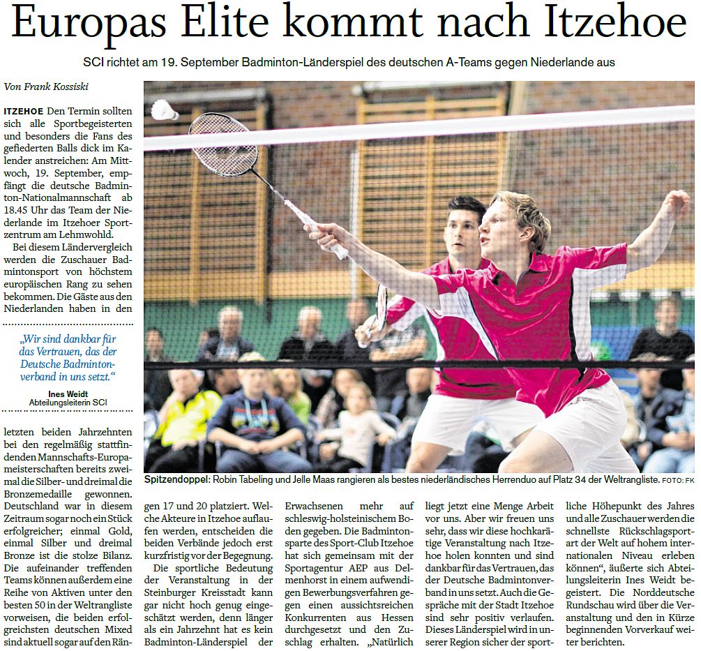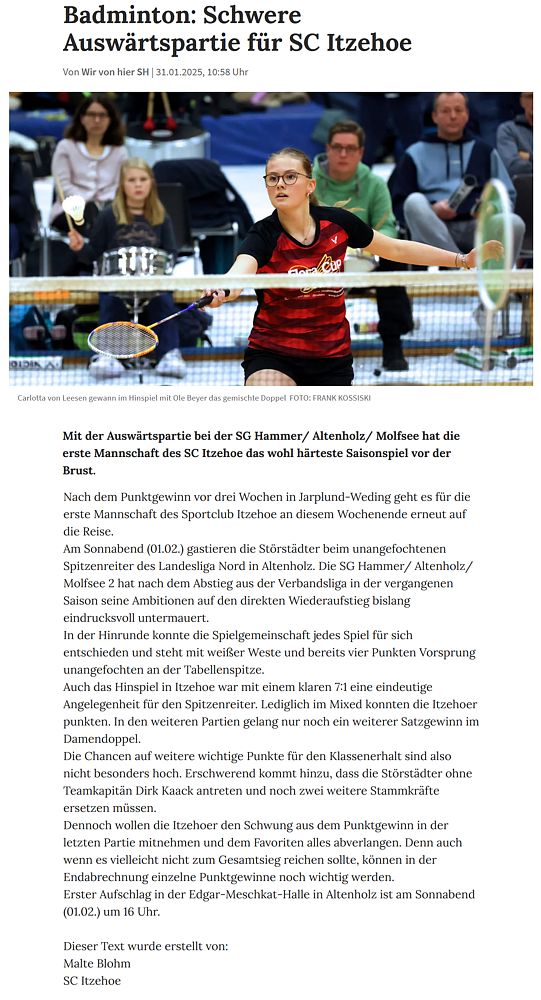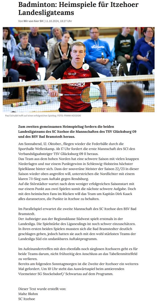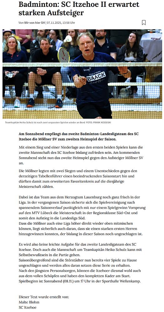 | Vorbericht im sh:z über das Heimspiel unserer zweiten Mannschaft am Samstag gegen das Landesligateam von BW Wittorf und das Auswärtsspiel unserer ersten Mannschaft am Sonntag bei der SG TSV Kronshagen / Kieler BC. |