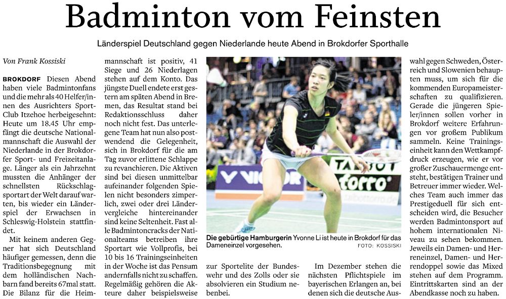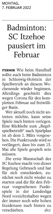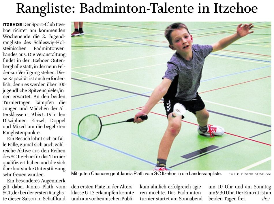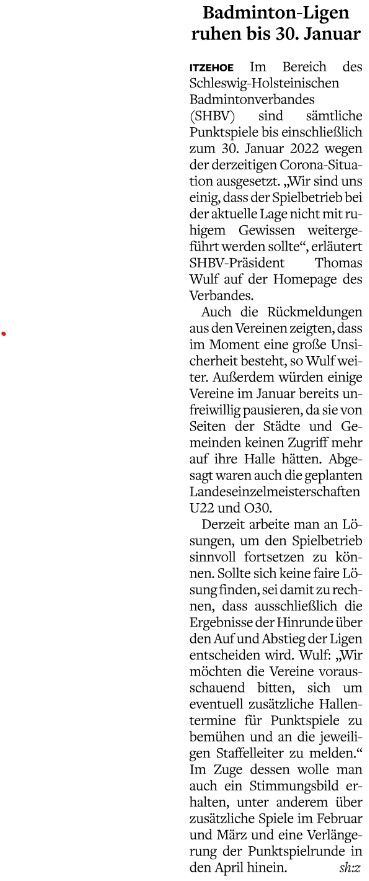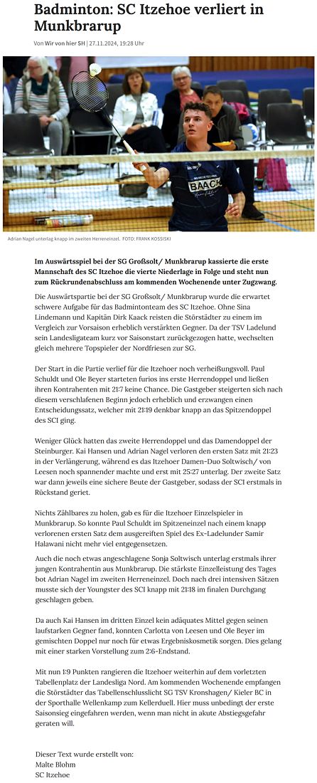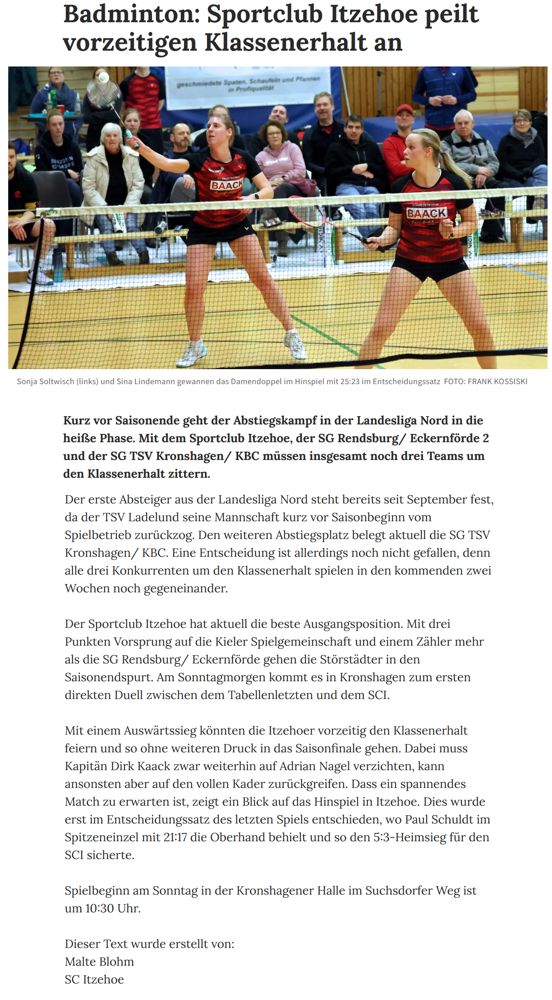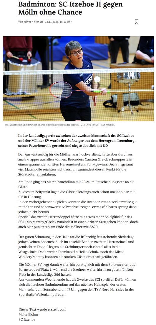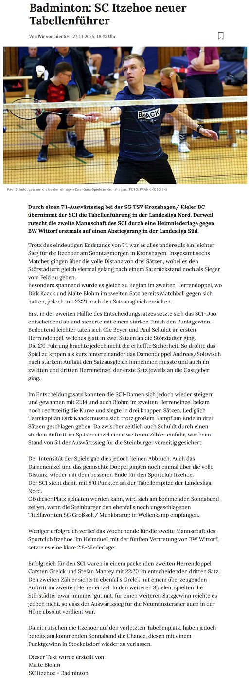| Bericht im sh:z über den Auswärtssieg unserer ersten Mannschaft bei der SG TSV Kronshagen / Kieler BC und der Heimschlappe unserer zweiten Mannschaft gegen das Landesligateam von BW Wittorf. |