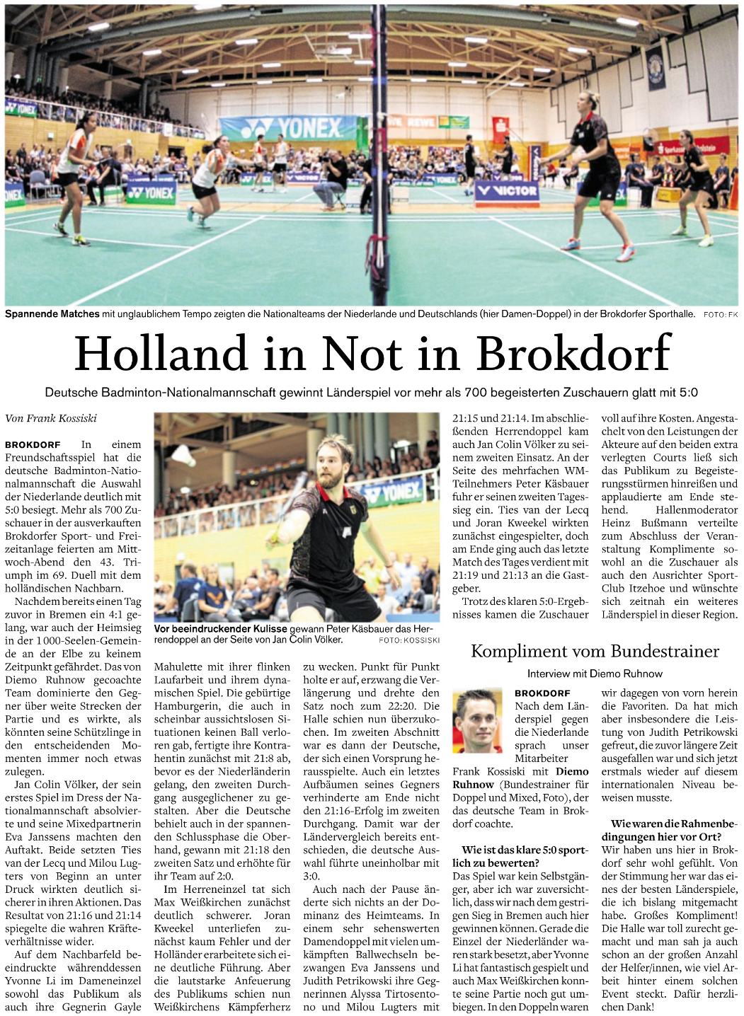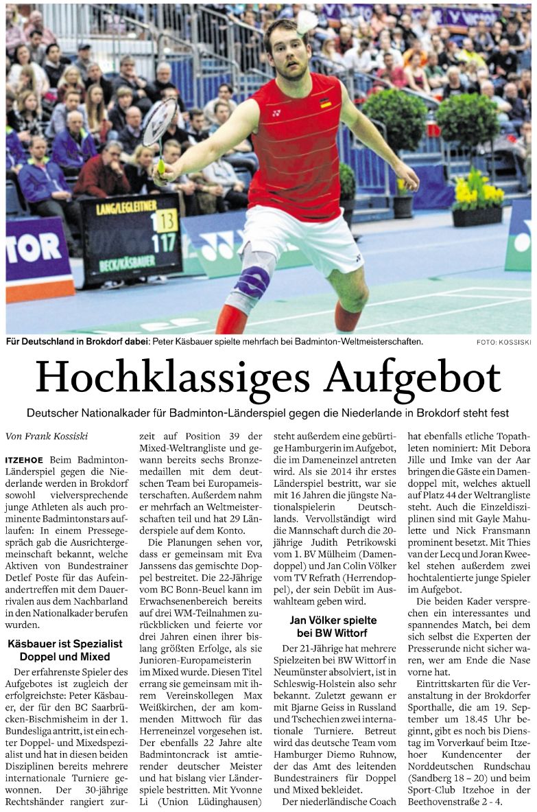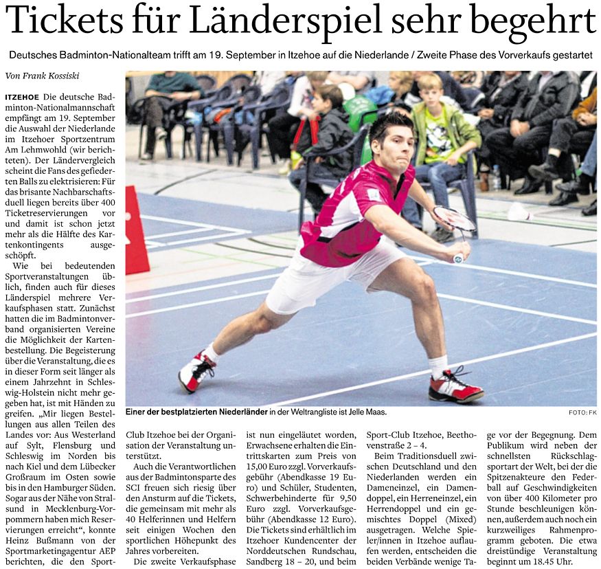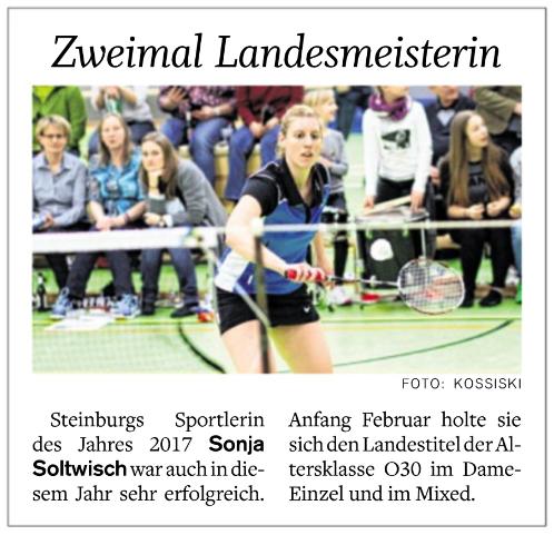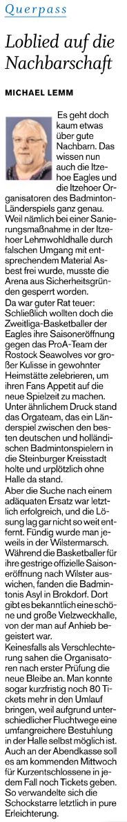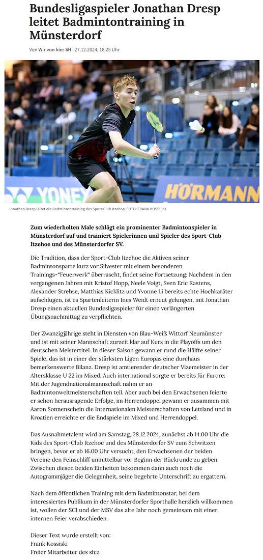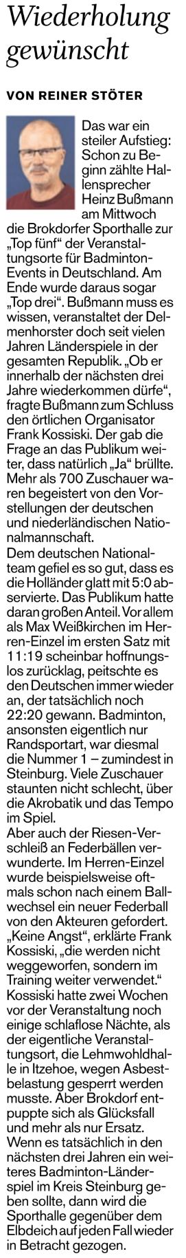 | Bericht im sh:z über den Auswärtssieg unserer ersten Mannschaft bei der SG TSV Kronshagen / Kieler BC und der Heimschlappe unserer zweiten Mannschaft gegen das Landesligateam von BW Wittorf. |