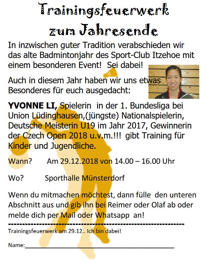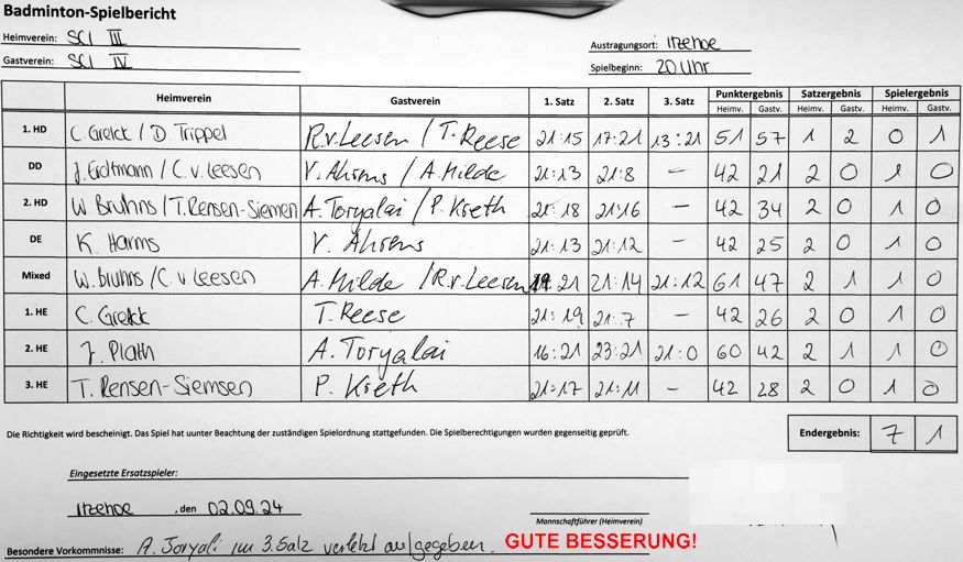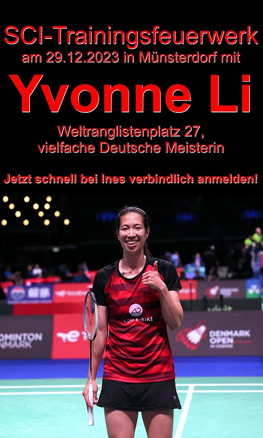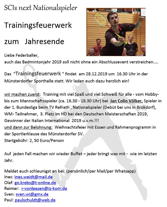 | Einladung zur SCI-Badminton-Spartenversammlung am 28.04.2025 um 19.30 Uhr. Für die Mannschaftsbesprechung bitte Fragebogen ausfüllen. |