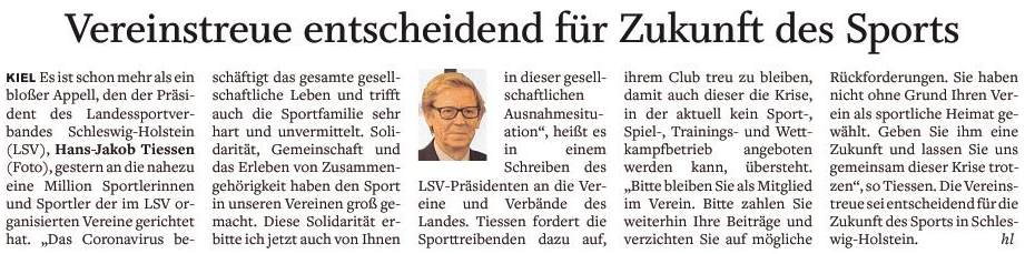 | Artikel im sh:z über das gewonnene Heimspiel unserer ersten Mannschaft in der Landesliga Nord gegen den TSV Nord Harrislee. |
