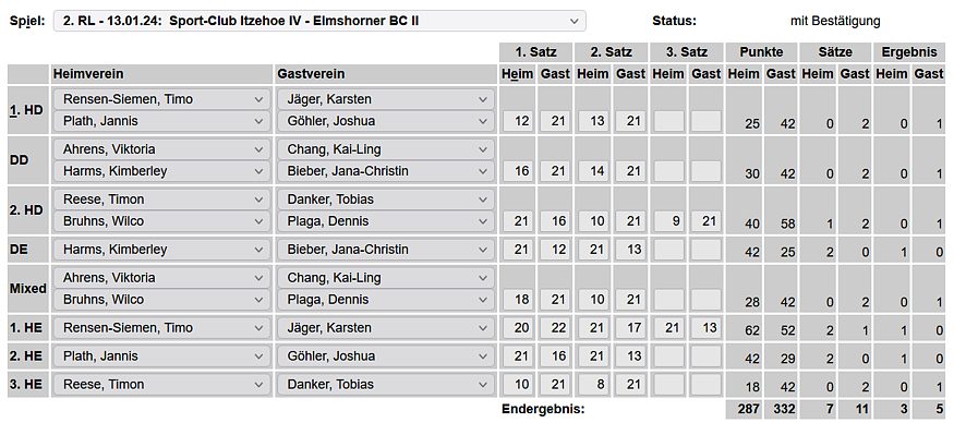 BC, Heimniederlage unserer zweiten Mannschaft in der Landesliga Süd gegen BW Wittorf 5, Auswärtsniederlage unserer dritten Mannschaft beim TSV Kremperheide I, vierte Mannschaft mit Auswärtsniederlage beim BSV Bad Bramstedt 2, unsere U 13-Kids holten in Neumünster ein Remis gegen BW Wittorf 2 und unterlagen BW Wittorf 1 mit 1:5, Leonie & Leonie, Adriana, Jasmin und Nilo waren beim Kreisjugendtraining in Eckernförde dabei. |