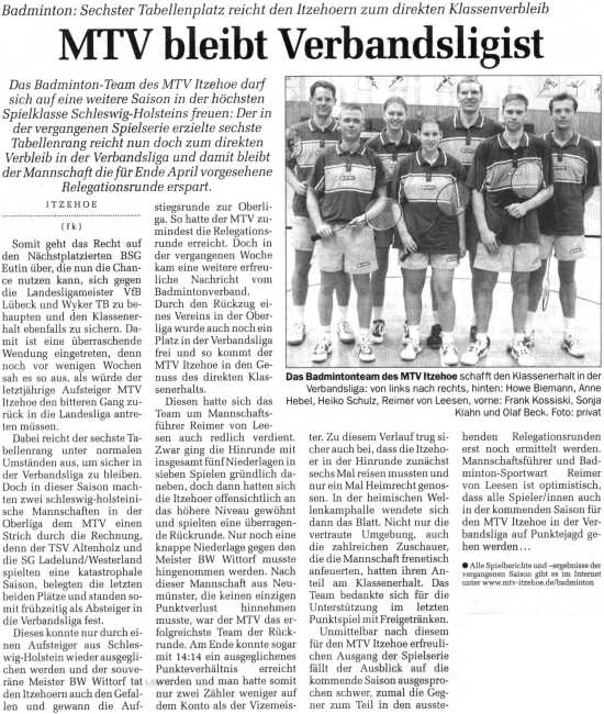 Die 1. Mannschaft in der Norddeutschen Rundschau vom 11.04.2002