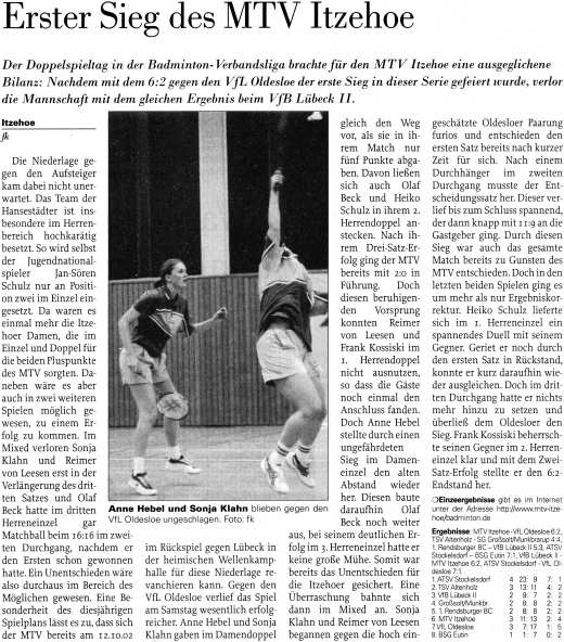Die 1. Mannschaft in der Norddeutschen Rundschau vom 08.10.2002