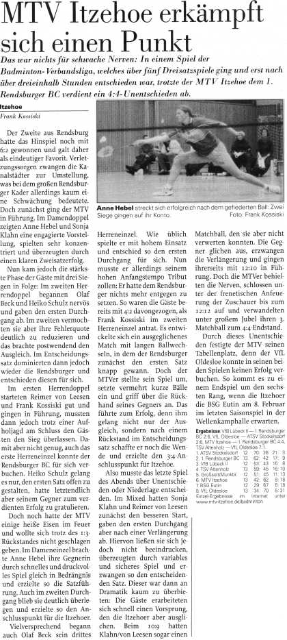 Die 1. Mannschaft in der Norddeutschen Rundschau vom 29.01.2003
