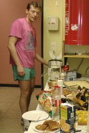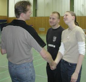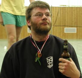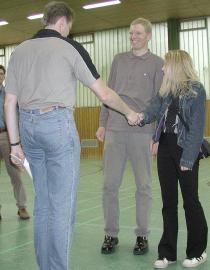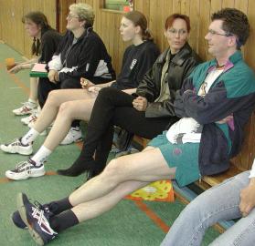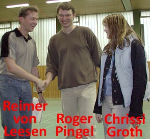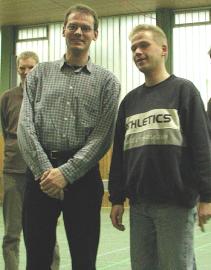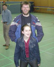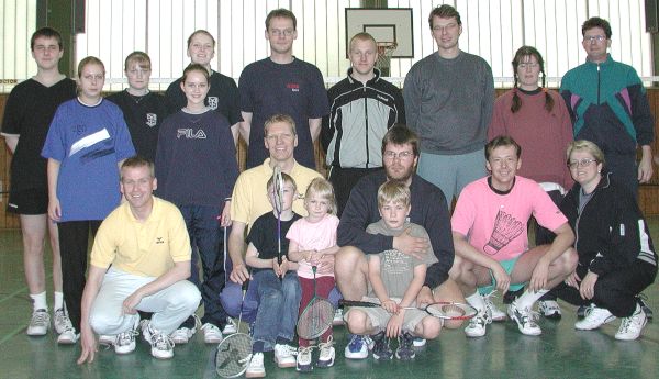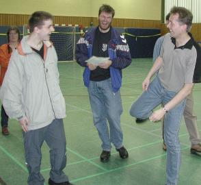 Das Organisationsteam um Susanne Groth, Reimer von Leesen und Jörg Sievers hatten sich wieder viel Mühe bei der Vorbereitung und Ausrichtung gegeben und so wurde das Turnier zu einem tollen Erfolg. Die Ausschreibung der Meisterschaften besagte in diesem Jahr, dass jede/r seine ältesten Trikots und Shorts anziehen sollte, die im Schrank gefunden werden konnten. Und so waren es unsere Nachwuchsspieler/innen, die vor Neid erblassten, in welch´ modischen Outfits Heiko, Reimer, Frank und Co auftraten... (Zitat: "Und so etwas hast Du früher wirklich in der Halle getragen...?") Aus den 14 Badmintonbegeisterten wurden schnell 7 Doppel geformt, die im Modus "jeder gegen jeden" nach dem neuen Zählsystem 5 x 7 gegeneinander antreten mussten. Ganz traditionsbewusst begann man in der ersten Runde mit Plastikbällen, dann mit dem Victor Service usw... Erst nach 21, zum größten Teil hart umkämpften Spielen, konnte der Titel vergeben werden. Der Zufall wollte es, dass die beiden Erst- und Zweitplatzierten erst in der letzten Runde aufeinandertrafen und so kam es zu einem echten Endspiel. Da am Ende beide Doppel jeweils eine Niederlage auf dem Konto hatten, mussten die Sätze ausgezählt werden, um den Vereinsmeister 2002 zu ermitteln. Welch´ eine Dramatik! Die einzelnen Platzierungen gibt es unten zu sehen. Nach der Siegerehrung ging es dann zum gemeinsamen Abendessen. Das heißt, fast wäre es gar nicht dazu gekommen, denn Reimer - noch völlig erschöpft von den Spielen - wollte in seinem Zustand geistiger Umnachtung eine Essensbestellung nicht zulassen... Erst nach lautstarkem Protest kam dann jeder zu seinem Recht und der tolle Tag fand doch noch ein harmonisches Ende. ;-) |